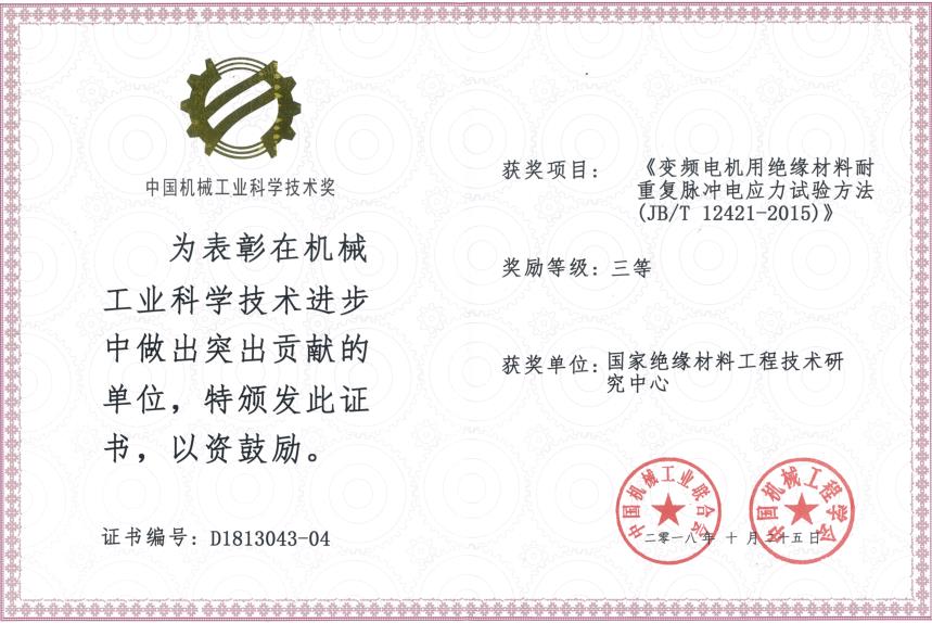 由中國機(jī)械工業(yè)聯(lián)合會和中國機(jī)械工程學(xué)會共同設(shè)立“中國機(jī)械工業(yè)科學(xué)技術(shù)獎”,是中國機(jī)械領(lǐng)域最具權(quán)威的獎項之一。近日,2018年度中國機(jī)械工業(yè)科學(xué)技術(shù)獎獲獎項目公布,我公司(國家絕緣材料工程技術(shù)研究中心)參與制定的行業(yè)標(biāo)準(zhǔn)JB/T12421-2015《變頻電機(jī)用絕緣材料耐重復(fù)脈沖電應(yīng)力試驗方法》榮獲 ...